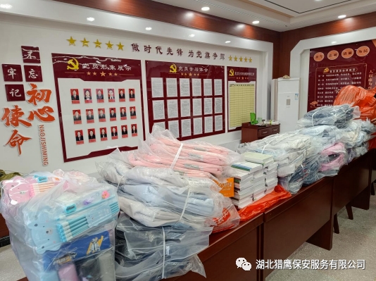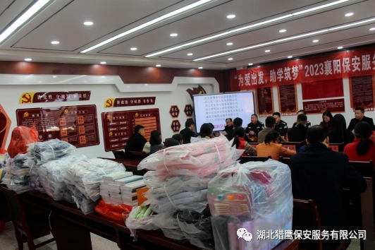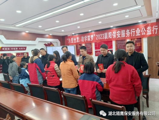 2023年11月24日在襄陽市公安局保安監(jiān)管大隊的帶領(lǐng)下,湖北獵鷹保安服務(wù)有限公司聯(lián)合襄陽其他保安服務(wù)行業(yè)一行7個單位走進(jìn)??悼h店埡鎮(zhèn)兩所學(xué)校,為貧困學(xué)生送去了資助金和一批書籍、文具、書包等物資。